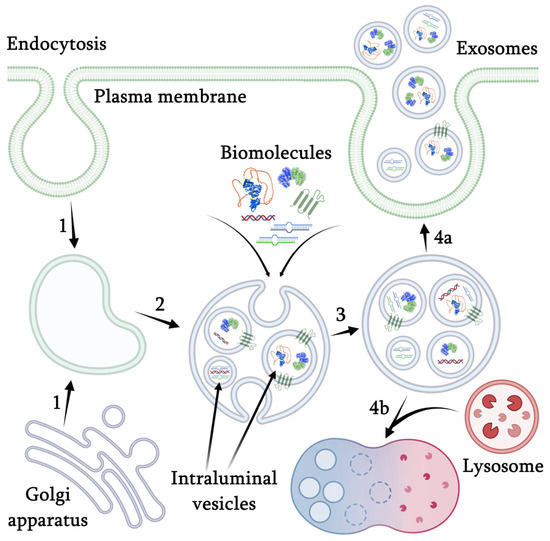 Mechanism of nanovesicles formation. 1—early endosome formation through the invagination of the plasma membrane cooperating with the regulatory components of the Golgi trans-network; 2—endosome maturation accompanied by invagination of the endosomal membrane with the formation of intraluminal vesicles that selectively accumulate various intracellular biomolecules by a special endosomal sorting complex: ESCRT-0, -I, -II, -III, and vacuolar protein sorting 4 (VPS4) ATPase; 3—formation of a late endosome or multivesicular body (MBT); 4a—fusion with the plasma membrane accompanied by the release of exosomes, regulated by two protein complexes from the GTPase family Rab and soluble NSF attachment receptor; 4b—fusion with lysosome and further degradation.