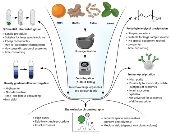 Various parts of plants are used to isolate the nanovesicles, mainly the fruits, roots, and apoplastotic fluid from their leaves. Currently, five approaches are applicable for plant nanovesicle isolation, namely differential and gradient density ultracentrifugation, precipitation using highly hydrophilic polymers (e.g., protamine, dextran, polyethylene glycol), size exclusion chromatography, and immunoprecipitation (Figure 2), with preference of the methods based on ultracentrifugation [70]. The methods based on ultracentrifugation are preferred due to resulting in a larger amount of the material [42]. Differential ultracentrifugation includes series of centrifugation cycles with different centrifugal forces and durations, providing differences in the densities and sizes of nanovesicles and other cellular components, including organelles, microvesicles, and apoplastic bodies [71]. Typically, the biological fluids are successively centrifuged at 5000×, 10,000×, and 20,000× g, followed by the ultracentrifugation step. For ultracentrifugation, the speed in the range of 100,000× g to 120,000× g is sufficient to pellet nanovesicles [72]. However, for the study on extracellular vesicles from the apoplastic fluids of A. thaliana leaves, recovery efficiency and quality were maximally improved by the ultracentrifugation at 40,000× g that allowed them not to use the speed of 100,000× g [35]. Later, the research of Huang et al. demonstrated the opposite results for the same model plant [72]. In another study, the nanovesicles were isolated from Nicotiana tabacum L., Vinca minor L., and Viscum album L. by differential ultracentrifugation at 50,000× g (the optimal speed for the nanovesicles sedimentation), followed by agarose gel electrophoresis purification to increase their purity [73]. Additionally, the method was improved by adding a thin pad (Optiprep™) to the bottom of the centrifuge tube that prevented the damage of nanovesicles [74]. This means that the issue of the most suitable ultracentrifugation conditions is still open and they should obviously be optimized for each plant species and type of the biofluids as the starting material. Moreover, the differential ultracentrifugation method should be used in combination with the additional purification methods, since the disadvantage of this method is the contamination of the resulting vesicles with protein molecules similar in density and size to the nanovesicles [42].
