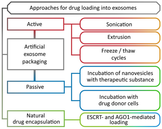 The composition of exosomes can also be artificially altered by introducing both high- and low-molecular-weight target molecules (Figure 3). There are two main methods of loading nanovesicles: active and passive. Active loading includes such methods as sonication, extrusion, and freeze and thaw cycles that temporarily disrupt the nanovesicle membrane, allowing various compounds to diffuse inwards, after which the membrane is repaired [100]. Passive loading is an incubation process during which the loading takes place. The incubation is carried out by two methods: incubation of nanovesicles with a compound [101], and incubation with donor cells of target molecules [102].