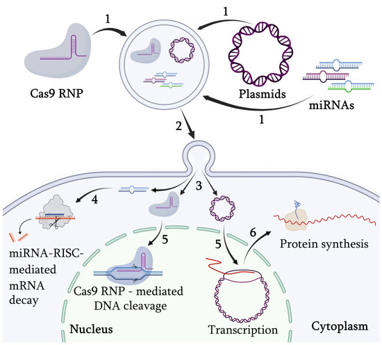The use of exosomal vesicles for genetic material delivery. 1—exosome loading with therapeutic macromolecules; 2—exosome delivery; 3—genetic material release upon fusion of the exosome with the cell plasma membrane; 4—miRNA—mediated regulation of gene expression through activation of the RNA-induced silencing complex (RISC); 5—nuclear import of Cas9—ribonucleoprotein (RNP) and plasmid DNA; 6—mRNA nuclear export for translation.