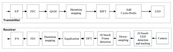 - Nguyen, H.; Min Jang, Y. Design and Implementation of Rolling Shutter MIMO-OFDM scheme for Optical Camera Communication System. In Proceedings of the 2021 International Conference on Information and Communication (ICTC), Jeju Island, Korea, 20–22 October 2021; pp. 798–800. [Google Scholar]