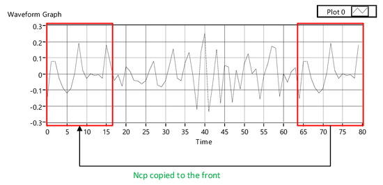 The cyclic-prefix (CP) is important in the OFDM system to mitigate inter-symbol interference. The length of CP is determined by the environment channel’s symbol length and time delay. The cyclic prefix is generated by copying the bottom part of the OFDM symbol to the top of the OFDM symbol. Figure 2 shows the creation and insertion cyclic-prefix to the OFDM symbol.