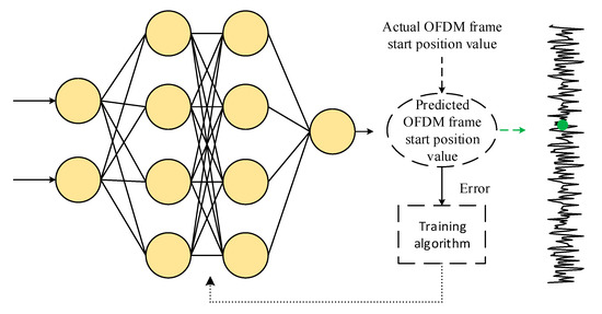 Van De Beek et al. suggested a time-frequency joint synchronization approach that uses CP to calculate a maximum likelihood function to predict the time and frequency deviation [17,18]. By utilizing the properties of cyclic-prefix, the start of OFDM frame may also be detected. In [9], we proposed the Van de Beek algorithm to detect the frame of RS-OFDM symbol in real-time for the OCC system. However, as we mentioned above, the mobility channel has a lot of effects on the OCC system (blur effect and SNR reduction, among others), so the conventional algorithm does not provide good performance for the RS-OFDM system. In this paper, we proposed deep learning for detecting the start of OFDM frame, as shown in Figure 3. We used a basic deep learning neural network model with two hidden layers to avoid overfitting the model. Following preamble detection, we can accurately detect the start of a frame of OFDM signals, improving the OCC system performance compared with matched filter technology in a mobility environment. In the case of overfitting, the accuracy of the test dataset is undermined when there are five or more hidden layers. The dataset was collected from several cases (different distances and velocities) with rolling shutter camera. The results of our proposed approach compared with the conventional scheme in [9] are shown in Section 5.