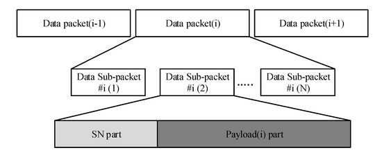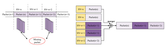 When a rolling-shutter camera’s frame rate exceeds (at least doubles) the transmitter’s packet rate, every data packet is sampled at least twice (i.e., two pictures). We receive the same packet at the receiver, generating packet merger confusion. The SN is added to DS to assist the receiver in decreasing the influence of the camera’s frame rate variation. Each packet contains identical DSs, which aids the receiver in removing superfluous data. When a DS is received, the receiver chooses which one has a compatible SN. As seen in Figure 5, the receiver side discards consecutive packets with the same SN and merges packets with successive SN (n − 1, n, n + 1).