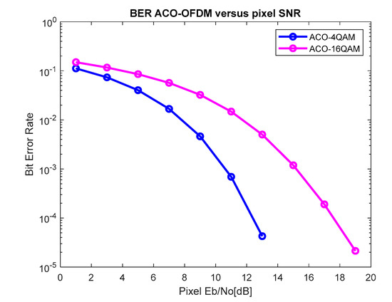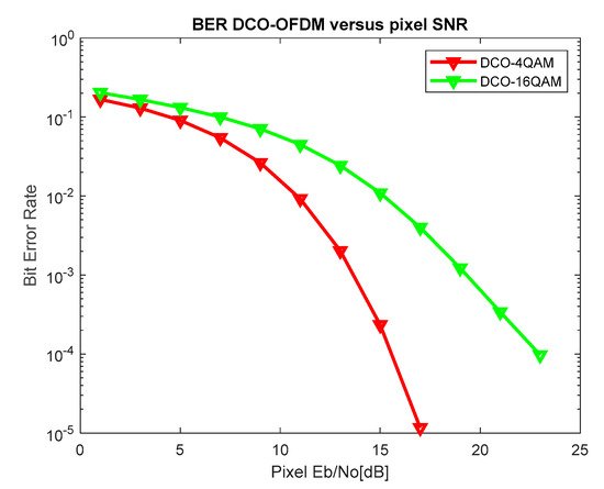 Figure 6 and Figure 7 depict the estimated BER curves of ACO-OFDM and DCO-OFDM versus pixel with bottom- and top-cutting levels appropriate for the proposed scheme’s deployed parameters. The figure shows that to attain a BER of O-OFDM schemes, the pixel Eb/N0 must be at least 23 dB with DCO-OFDM and 18 dB with ACO-OFDM. The relationship between and SNR are as follows: