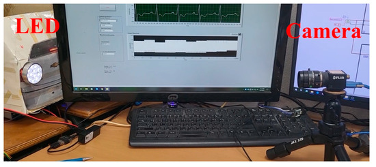 Contrasting VLC and Li-Fi systems, which use photodiodes to receive data, optical camera communication uses a camera as the detector. Refs. [4,5] show that the OCC system performance depends on the camera type. Global-shutter and rolling-shutter cameras are two types of cameras for this arrangement on the market. The camera frame rate, which decides whether the sampling rate meets the Nyquist sampling requirement, is the primary determinant of OCC performance with the global shutter camera. The rolling-shutter camera sampling rate is determined by both the camera frame rate and the camera’s rolling rate.