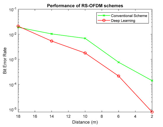 Figure 10 displays the results of RS-OFDM schemes employing the Van De Beek algorithms and a deep learning neural network with varied distances at a 100 us exposure time (2–18 m). With a deep learning neural network, we can achieve BER of at 2 m, while with the conventional scheme, we just achieve BER of . When the same distance and environment were used, the deep learning neural network decoder considerably enhanced the system’s performance in the mobility environment over the conventional approach. For LED detection, a deep learning neural network was also used. It can also help with data decoding, which helps enhance performance for long communication distances and mobile contexts. In our implementation, we used a velocity of 2 m/s (walking velocity) to ensure that the proposed technique would suit indoor applications, considering the mobility effect. We implemented this scheme at a communication distance of 1 m, a visual representation of which is given in the Supplementary Materials section of this paper.