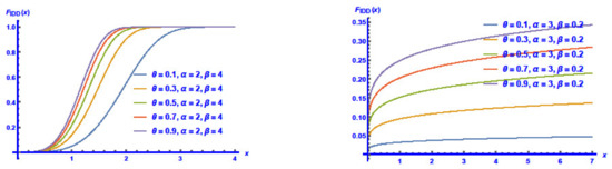Figure 1. Plots of the CDF of PDD for varying the value of α ,   β ,   θ .