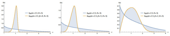Figure 3 displays the pdf plots of the suggested PDD and base DD for some parameters. It is clear that the value of the parameter β changes the pdf’s behavior of both distributions for fixed values of α and θ .