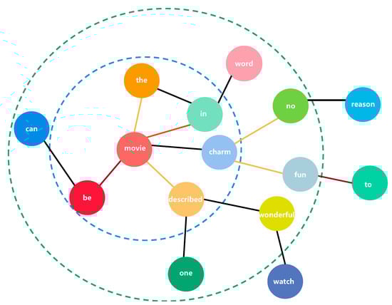 In addition, graph convolution based on word co-occurrence relationships and semantic dictionary composition can only capture the relationship of non-continuous entities in the text and cannot simultaneously capture the short-distance and long-distance dependencies of words in sentences. For example, a text graph is constructed from a corpus of word co-occurrence relations and semantic dictionaries, as shown in Figure 1. Here “This movie can be described in one word: wonderful.” is a sentence in the corpus. Taking “wonderful” as the center, the blue circle represents the aggregation of one-level neighbor node information, and the green circle represents the aggregation of two-level neighbor node information. Among them, “wonderful” is used to modify “movie” in the sentence, and it is very useful for analyzing the expression of the text as a whole. However, the two word nodes “movie” and “wonderful” in Figure 1 are not directly related, but there should be a certain dependency between them. Graph Convolutional Network only aggregates direct neighbor node information, so one layer of GCN can only capture short-distance dependencies of words in sentences. Capturing long-range dependencies between words such as “movie” and “wonderful” can be solved by increasing the number of GCN layers. However, current research shows that multi-layer graph convolutional networks for text classification tasks incur high space complexity. At the same time, increasing the number of network layers will also make the local features converge to similar values. To overcome this problem, we introduce dependencies when building the text graph. Dependency syntax is mainly concerned with the relationship between words (sentence components) in a sentence, and it is not affected by the physical location of the components. By introducing dependencies, short-range dependencies and long-range dependencies can be well utilized while also providing syntactic constraints and partially reducing the number of GCN layers.