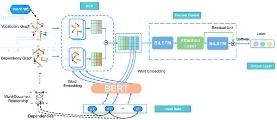 Now, many studies try to combine GCN with other models. Ye et al. 2020 [14] input the word and document nodes trained by GCN and BERT’s word vector into the BiLSTM classification model, where the input vector of GCN is a one-hot vector. Lu et al. 2020 [15] integrated the vocabulary graph embedding module with BERT and achieved good results in many public datasets, where GCN uses BERT’s word vector. In contrast to this, in our method, GCN uses BERT’s word vectors and uses dependencies when building the text graph. One graph focuses on extracting dependencies between words, and the other graph focuses on word co-occurrences. We use a two-layer BiLSTM with attention combined with GCN and BERT; one layer is used to focus on the word sequence, the other layer focuses on the sentence sequence, and a residual operation is added after BiLSTM to learn the residual.