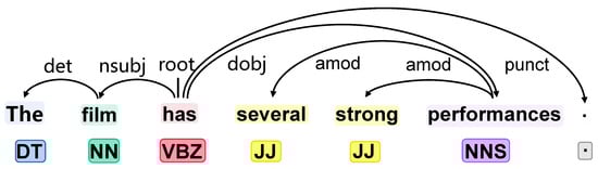 The results of dependency analysis are usually represented by a labeled directed graph. For example, as shown in Figure 3, “root” represents the central word “has”. Examples of the relationship between the performance head word and its subsidiary words are “has” and “performances”. The result of dependency analysis shows that the relationship between these two words is a direct object (dobj, direct object) relationship.