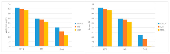 In order to further study the benefits of the various components of IMGCN, this paper conducted ablation experiments on the effectiveness of the constructed model. Since the experimental results of IMGCN and the three variant models on the R8 dataset are not much different, Table 2 only shows the results of the ablation experiments on the three public datasets of SST-2, MR, and CoLA. We selected two indicators, weighted average F1-Score and macro F1-Score. The experimental results of the IMGCN and the three variant models prove that the three components used in this paper can improve the performance of IMGCN. Among them, MGB is a model that only uses point-state mutual information to build a graph network for learning and stitches it together with the local information obtained by BERT. Based on the MGB model, IMB introduces a model that relies on syntactic and semantic dictionaries for composition. IMGCN is a model that further fuses graph features and local features obtained by BERT using hierarchical BiLSTM on the basis of IMB.