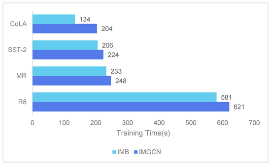 As can be seen from Figure 5, the IMB model directly splices the output features of the GCN model with the pre-trained BERT word vectors for classification, and the IMGCN model extracts hierarchical features based on the combination of the two features. As can be seen from Figure 5, when the model becomes more complex, the training time required for the model will also increase. Compared with the IMB model, the training time required for each epoch of the IMGCN model is 70 s, 18 s, 15 s, and 40 s for the four datasets of CoLA, SST-2, MR, and R8, respectively. The best results are achieved around 15 epochs of training. Therefore, compared with the IMB model, the overall training time of the IMGCN model on different datasets increases by about 4 to 17 min, while the classification accuracy and Weighted avg value of the IMGCN model on the CoLA dataset increase by 1.92% and 2.32%, respectively. Therefore, compared with the improvement of the model classification effect, the increase in the model training time is within an acceptable range. Therefore, it is meaningful for us to further fuse and learn the feature information obtained by the GCN model and the pre-trained BERT by using contextual attention and the hierarchical model.
