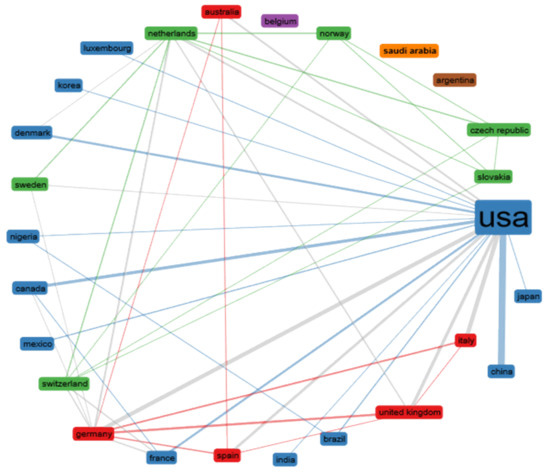 Figure 2 shows details about the inter-country collaborations among authors in general (including the first, corresponding, and as co-authors of articles) using various colors to indicate their clusters of cooperation. Altogether, six clusters were observed in the map. The node representing each country and the lines (links) that connect them with other countries have different sizes and thicknesses, respectively, indicating their relevance and the strength of collaborations that exist among them. The names of the countries involved are by default written in small letters [73]. The USA was observed to be the lead country with the biggest node, having the highest number of links with different countries of the world, including China, Canada, France, India, Denmark, Mexico, Japan, Spain, Korea, Luxembourg, and Australia. Hence, it is obvious that the top-rated countries in this field of research exhibit strong cooperation with each other. It could be seen that developed countries dominate the research field, and this indicates the significance of the subject being understudied. Besides, scientific research leaders are mainly from the developed countries of the world.