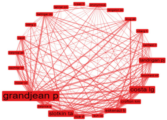 The co-citation analyses conducted in this study were carried out to evaluate the close relationship or similarities that exist between different published articles, based on how often they were frequently cited together [75]. These analyses always help to obtain a full understanding of the notable information concerning a topic or research theme in a certain field of study from the greater part of the available sources, references, and cited authors, and to identify the most important research articles in that field. Co-citation grows over the years; hence, recently published papers gather lesser co-citations than older ones [53]. In the present study, the results of the co-citation analyses of authors with respect to research investigations conducted between 2011 and 2020 are summarized in Figure 5. Although the biblioshiny output (excel spreadsheet) for the co-citation network shows about 50 nodes grouped into 3 clusters, the visualized map (Figure 5) only reveals about 23 nodes, with an all-in-one cluster (red) for convenience’s sake. Some authors in the cluster exhibit very strong co-citation with others; this is revealed in the thickness of their links and the sizes of their respective nodes. Weaker co-citations are also demonstrated with weaker links [73]. Grandjean P., Costa L.G., Slotkin T.A., Landrigan P.J., Crofton K.M., Eskenazi B., Oecd, and Rice D. were among the authors shown to have stronger co-citation in the figure compared to others. Most of them are captured in Table 2, Table 5 and Table 6 as the most impactful and cited (locally and globally).