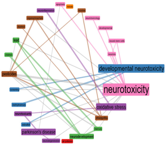 It is obvious that keywords with the highest number of occurrences (n > 15) were “neurotoxicity”, “developmental neurotoxicity”, “oxidative stress”, “Parkinson’s disease”, and “pesticides”. However, all the keywords plus showed occurrences that were ≥15 except “disease”, “methylmercury”, and “model” with n = 14 each. As the term “neurotoxicity” addresses harm caused to the brain or peripheral nervous system due to human exposure to some natural or synthetic toxic materials, the above-mentioned keywords and keywords plus showed pesticides (including chlorpyrifos), lead, and methylmercury as the top neurotoxicants. In addition, the huge effects of these toxic chemicals on “children”, especially unborn babies, are noteworthy. Lead (Pb) has been reported to have possible impairment on the intelligence quotient (IQ) of these young fellows [8]. Besides, high concentrations of polychlorinated biphenyls (PCBs) in pregnant women’s blood could reduce both the weights and IQs of unborn babies, as well as trigger many other neurological conditions [2]. Hence, “developmental neurotoxicity”, defined as the damage done to the “developing brain and nervous system” of living organisms by some identified neurotoxicants or neurotoxins, has attracted the attention of scientists often [77], even though the available information regarding humans is very scarce. Zebrafish, medaka, and some other fish species have been used as model animals in the developmental neurotoxicological and ecotoxicological studies of many neurotoxicants, with an emphasis on their developmental stages (early life) [3,78,79].