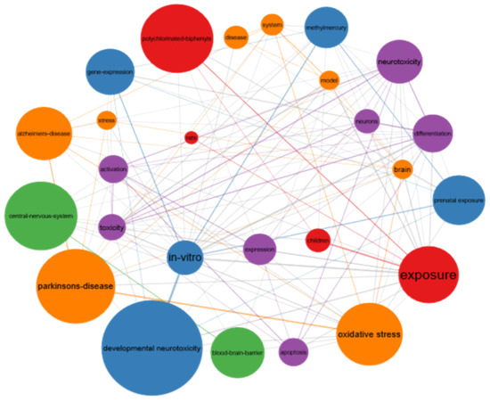 Similarly, the cooperation among the top authors and institutions in this research field is depicted in Figure 3 and Figure 4. The following researchers exhibited strong collaboration as depicted in Figure 3: Seidler FJ, Slotkin TA, Leist M, Delp J, Gutbier S, Hoelting I, and Klima S. This is revealed in the thickness of the lines that connect them. They are all among the top 20 authors as shown in Table 2, except Klima S. The five of them (5 nodes) belong to the same cluster. There are about 14 clusters altogether on the map, as shown by the different colors representing each cluster of collaboration. Authors with the same color are in the same cluster (i.e., working closely together or having intimate collaboration) [74]. Other most relevant authors (with big nodes), such as Schymanski EL and Shafer TJ, however, do not show any strong collaboration with other researchers, as captured in Figure 3.