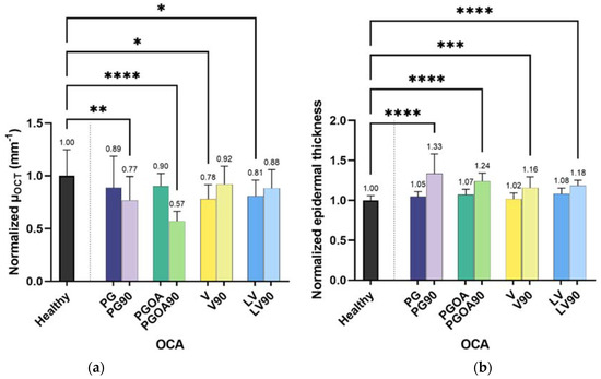 Normalized changes in the signal attenuation coefficient µOCT (a) and in epidermal thickness (b) of non-treated skin after the application of four different OCAs at two different times t1 = 5 min and t2 = 90 min (x-axis, no name suffix and suffix “90”, respectively). The number of asterisks denotes the decreasing p-value whereas p ≤ 0.05, p ≤ 0.01, p ≤ 0.001 and p ≤ 0.0001 are symbolized by 1–4 asterisks. Raw mean values are presented in Tables S1 and S2 (Supplementary Information).