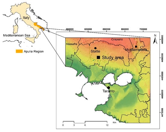 The investigated area (Figure 1) falls within the so-called area of the Production Settlement Plan (PIP) of the municipality of Statte (Taranto province, Apulia Region, southern Italy; 40°32′25″ N, 17°12′51″ E). Specifically, it regards an area outside the ex-MATRA, within 100 m of the industry.