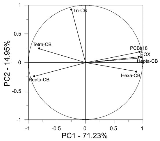 Contribution of EOX and PCBs to the first two principal components resulting from the application of PCA to the same parameters.