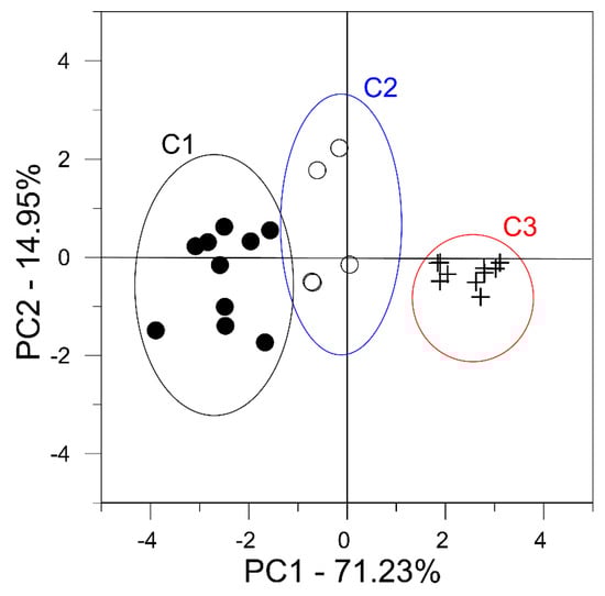 Scatterplot of the soil samples on the plane of the first two principal components resulting from the application of PCA to EOX and PCB contents. C1, C2, and C3 identify the three groups of soil samples resulting from the application of the Cluster analysis to the scores of the first two main components.