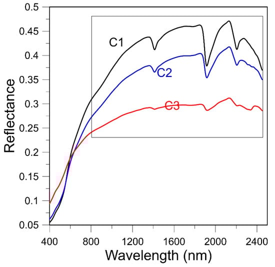 Average reflectance (R) spectra of soils from the three clusters (C1, C2, C3) resulting from the application of PCA and Cluster analysis to the investigated soil properties.