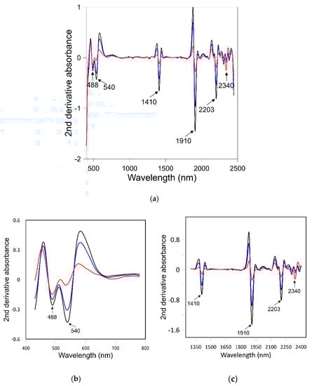 Average second derivative of absorbance (A = log 1/R) spectra (a) and its magnification in two significant ranges of visible (b) and near-infrared (c) region of soils from the three clusters.
