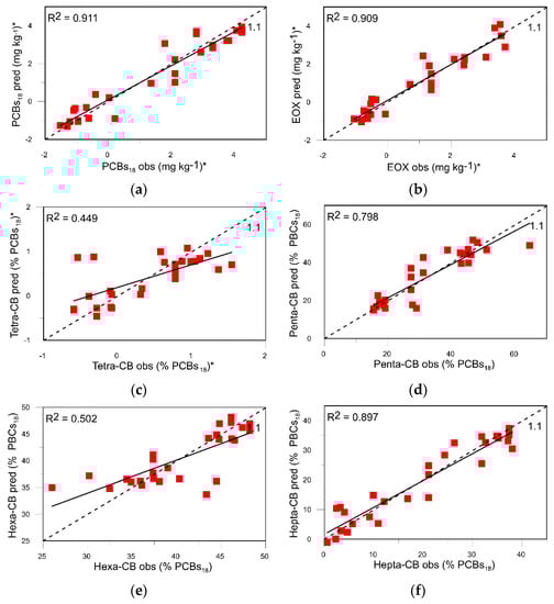 Plots of the measured against the predicted PCBs (a), EOX (b), Tetra-CB (c), Penta-CB (d), Hexa-CB (e), and Hepta-CB (f) contents based on PLSR models. The 1:1 line is indicated on each figure. * = log-transformed values.