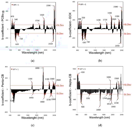Figure 7 shows the bar plots of regression coefficients, b, versus wavelength derived after PLSR analysis for the best predicted variables (PCBs18, EOX, Penta-CB, and Hepta-CB), with indication of the wavelengths identified as important for the prediction of these variables; i.e., the wavelengths that, for each calibrated model, have both the b-coefficients beyond or below the fixed threshold of ± st.dev. and the VIP > 1.