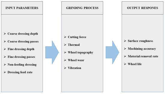 To solve the MCDM problem, an experiment was performed. The model of the experiment was presented in Figure 1. According to this model, the input parameters of the experiment are the input factors of the dressing process and the grinding process. The input parameters of the dressing process and their levels are described in Table 2. These factors will affect the grinding process, which is characterized by the cutting force, the thermal, the wheel topography, the wheel wear, and the vibration. The grinding process results are shown through the output responses, including the surface roughness, the machining accuracy, the material removal rate, and the wheel life. In this experiment, the surface roughness Ra, the roundness Rn (represents for the accuracy), and the wheel life are selected for the experimental responses.