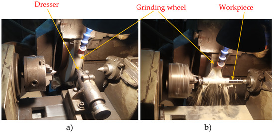Experimental setup. (a) Setup for wheel dressing; (b) Setup for cylindrical external grinding.