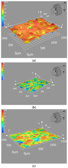 - The proposed optimal dressing mode has all three components: coarse dressing, fine dressing, and non-feeding dressing. That proves the role of fine dressing and non-feeding dressing. This can be explained with the illustration of Figure 3 as follows: after rough dressing, the wheel surface is very undulating, and the wheel topography is unstable (Figure 3a). When grinding with this mode, the wheel will wear quickly, and the surface roughness and the roundness are high (see Table 3—alternative 1). However, the wheel surface is less undulating, and the wheel topography is more stable after fine (Figure 3b) and non-feeding dressing (Figure 3c). As shown in Figure 3b, after fine dressing, the wheel topography was noticeably flatter than that after rough dressing (Figure 3a). In addition, after non-feeding dressing (Figure 3c), although the grinding wheel surface has the same maximum protrusion height of abrasive grains of 64 (µm) as after fine dressing (Figure 3b), the wheel topography was significantly flatter than that after fine dressing. So, non-feeding dressing reduces the wear of the grinding wheel. As a result, the 3rd alternative has a long wheel life as well as a low surface roughness and roundness.