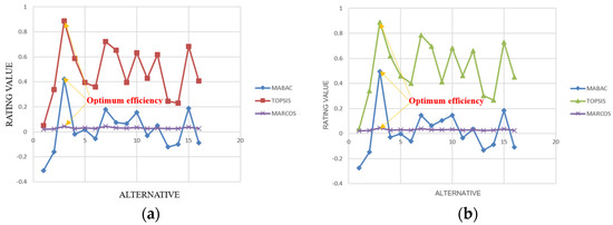 Figure 4. Graph to compare MABAC, TOPSIS, and MARCOS results. (a) Entropy weight. (b) MEREC weight. - -