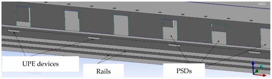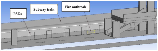 The emergency scenario is as follows: a subway train caught fire between two stations, but it manages to reach the station to evacuate the passengers. The fire is supposed to be caused by mechanical or electrical failures [14,21], close to the middle of its length (6 cars, total length 120 m), which leads to the initiation of a fire under its chassis [22,23]. On the other hand, in order to simulate the situation corresponding to one of the most dangerous scenarios regarding the spreading of smoke in the subway station (worst case scenario), the fire was placed by defining a zone specially for this (2 m long and 1 m width), on the lower side of the train towards the platform, in the middle of its length (60 m from the train start and 60 m from the train end). This position was also chosen so that it is between two doors of the PSD system (see Figure 3).