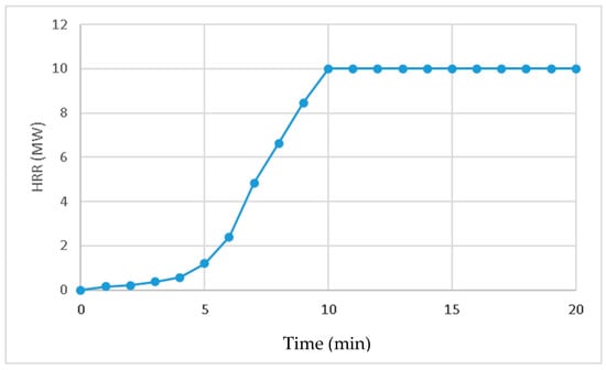 Concerning the maximum thermal power of the fire heat release rate (HRR), most studies dealing with fires in metro stations use values between 5 and 10 MW. For example, values of 5 MW were proposed by Jung et al. [20] and Xi et al. [24]; maximum HRR values of 7.5 MW were used in the CFD studies [25,26,27,28], and values of up to 10 MW in other numerical analyses [14,16,29]. Consequently, a maximum HRR value of 10 MW was considered in this study to verify under most unfavorable conditions the operation of the ventilation system of the subway station provided with PSDs. Furthermore, the fire growth considered in the simulations is based on a “t2 fire model” HRR curve (Figure 4). As a result, the maximum HRR and pollutant emissions increased in the first 10 min of the simulations as in the case of a real fire [30].