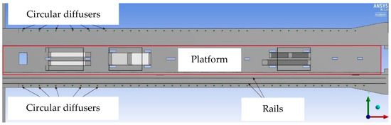 Figure 9. Subway station geometry in the numerical model. - Computational domain discretization: finite volumes—unstructured mesh, based on tetrahedral elements. The mesh was refined in the following regions (using local sizing discretization functions): near the circular diffusers of the station ventilation system (Figure 10), area close to the air exhaust devices of the UPE system, area adjacent to the fire outbreak, and nearby the subway rails.