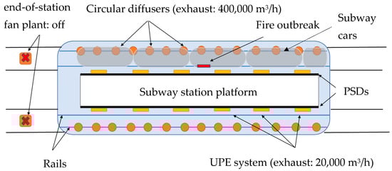 On the other hand, the PSDs in the stations certainly have an impact on ventilation in the case of emergency. Chen et al. [14] investigated the smoke control system for a typical subway station of the Taipei Rapid Transit System without/with PSDs. Their results showed that, in the case of the configuration with PSDs, smoke evacuation is achieved in a shorter time by the two tunnel ventilation systems. Hu et al. [15] numerically studied (Computational Fluid Dynamics—CFD modeling) the most effective way to assure the exhaust of smoke in the event of a train on fire, stopped beside the platform of a subway station provided with PSDs. Their conclusion was that the best ventilation strategy is ensured by activating the exhaust system from the tunnel ceiling and the exhaust system from the platform. Another ventilation approach was proposed by Meng et al. [16] in the case of a train fire at subway station with PSDs, based on CFD simulations: the station air supply system, platform exhaust system, and the over track exhaust system are on, while the platform air supply system and under platform exhaust system are off. In addition, Roh et al. [17] showed, also via CFD studies, that when using PSDs and ventilation systems, the time available for evacuation increased by almost 6 min compared to the scenario without PSDs (for the modeled subway station). Li and Zhu [18] performed CFD simulations for an island-type subway station, equipped with PSDs, in the event of a fire on the platform. They concluded that opening the PSDs on both sides of the platform improved the efficiency of mechanical smoke exhaust and therefore the time to maintain safe evacuation conditions for people increased. The effect of PSDs on smoke evacuation from a subway station was also studied by Wang et al. [19], by performing twenty-four CFD simulations for different PSD switch modes. The results showed that the closing/opening of the PSDs is deeply related to the position of the fire and the ventilation systems available in the station. The impact of PSDs on the evacuation of smoke and pollutants was also studied by Jung et al. [20] for a subway station with three underground levels, using CFD modeling. The results of the simulations performed for eight emergency situations indicated that the optimal smoke control (including opened/closed PSDs) depends on each fire scenario considered.