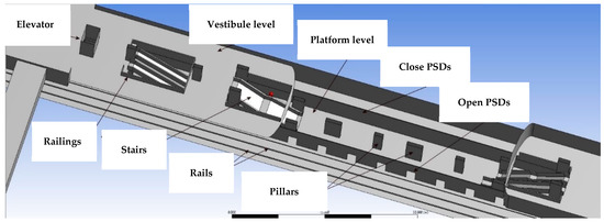 The configuration taken into consideration is based on a two-underground-level subway station equipped with PSDs. The entire description of this configuration, as well as the hypotheses of the emergency situation, are given below, followed by details concerning the CFD model development and the presentation of results in terms of air flow, temperature, and CO and CO2 concentrations in the computational domain, focusing on regions of particular interest (e.g., near the PSDs, station platform).