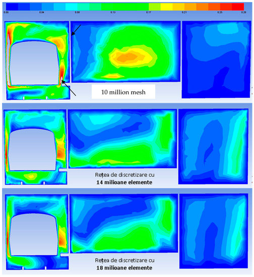 It is worth mentioning that thorough studies were performed in order to obtain the grid independent solutions, considering three meshes with 10 million, 14 million, and 18 million elements (obtained using different settings for local mesh controls, e.g., “growth rate” [36]: 1.20 for 10 million mesh, 1.18 for 14 million mesh, and 1.14 for 18 million mesh). These three meshes were analyzed by comparing air velocity in a cross section through the fire outbreak (Figure 11). The results show that the velocity field for the coarser mesh is totally different (with much higher air velocities) from those for the other two (refined) meshes, while the differences between 14 million mesh and 18 million mesh are minimal. Consequently, the discretization with 14 million elements (exact number: 14,164,713 cells) was employed to perform the study.