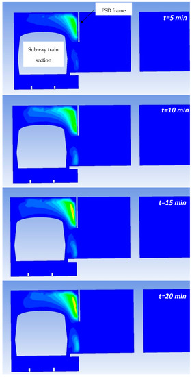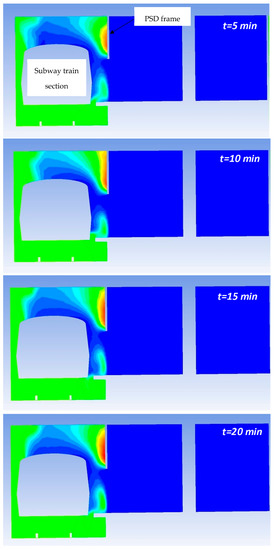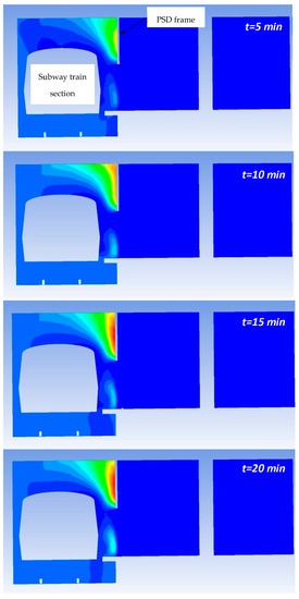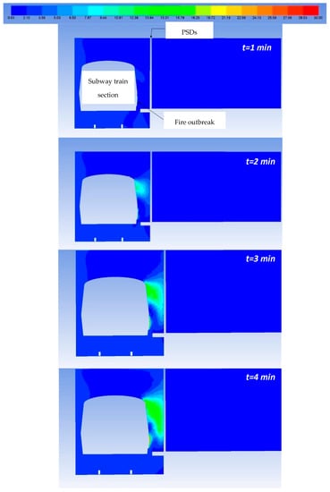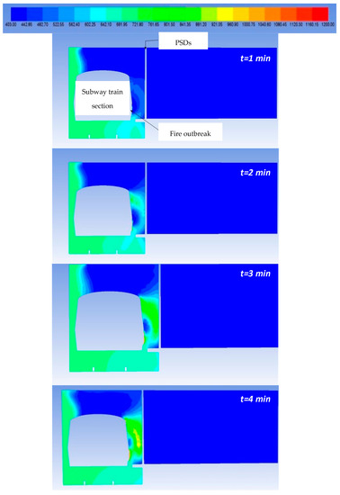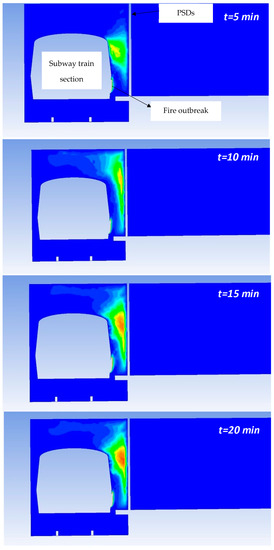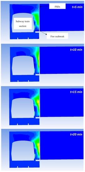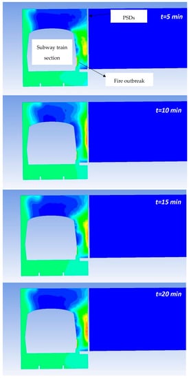 It can be seen that the area of the subway train with the fire outbreak is missing because the temperature in this region is higher than the maximum temperature scale used to more clearly represent the temperature fields in these figures. The maximum temperatures in the fire outbreak region have values between 900 and 1100 °C, in accordance with the temperature levels determined experimentally in [49] for fires with similar HRR values to those in this study. On the other hand, it is worth mentioning the important effect of the PSDs on limiting the propagation of hot air into the subway station. It can be clearly seen that if PSDs did not exist, a large amount of hot air would reach the platform area and prevent the safe evacuation of passengers.