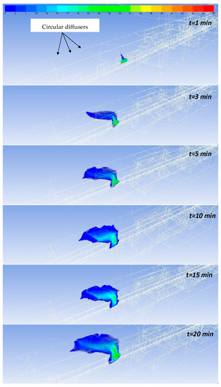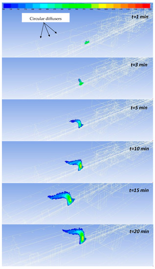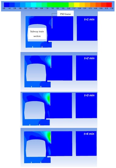 It can be observed that, in the first minutes, CO2 accumulates under the subway (maximum concentration: 77,000 ppm) as the density of this gas is higher than air density. Furthermore, the impact of PSDs to limit the penetration of pollutants into the station is even more obvious in this case, as the PSD system stops the spread of CO2 at the entire system height. Finally, CO2 is driven by the upward movement of air towards the ventilation devices above the train, following the same distribution pattern as CO.