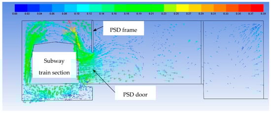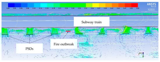 It can be seen that the velocity vectors are oriented everywhere from the platform in the direction of the tunnel. In addition, air velocity vectors are analyzed in the cross section through the door of the PSD system near the fire outbreak (the same section from Figure 18, Figure 19, Figure 20, Figure 21, Figure 22 and Figure 23)—Figure 25. The direction of air flow through the open door is clear: from the platform towards the tunnel and further to the evacuation above the train and under the platform.