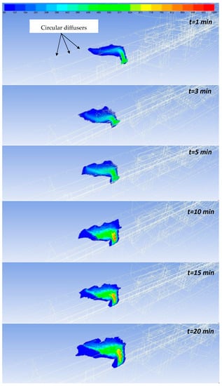 The temperature fields obtained during the simulations are presented in Figure 12 (minutes 1–4) and Figure 13 (minutes 5–20) for a cross section through the area of the fire outbreak, on the left side of it (direction of propagation for hot air and pollutants).