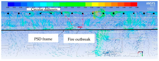 Air velocity vectors (m/s)—cross section through the door of the PSD system near the fire outbreak (minute 20).
