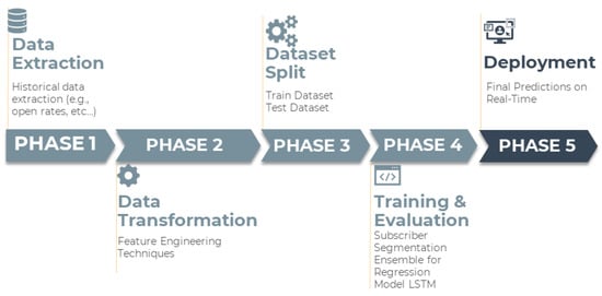 One of the most important channels of marketing communications is email marketing [2,3,4]. It consists of sending the best offer or communication to the right person at the right time, based on subscribers profiles. In a broader perspective, any email message sent by a company to a subscriber consists of email marketing [5,6,7]. In 2015, a study conducted by direct marketing stated that more than 90% of businesses use email marketing as a manner of direct and efficient communication, which strengthens the Return on Investment (ROI) rates [8]. In 2017, a study conducted by Salesforce [9] stated that one of the channels with the highest growth in recent years was an email with a rate of 83%. In the same year, VentureBeat stated that email was the channel with the highest ROI for marketers, surpassing social networks [10]. For every dollar, email marketing generates 38 dollars in ROI. In another study carried out by HubSpot [11] in 2020, approximately 80% of marketers state that the interactions with the subscribers, by email, have improved compared to previous years. Furthermore, companies, on average, manage to earn 42 dollars for each dollar invested in the advertising sent by email. With the exponential growth of email over the years, broad flows of campaigns are sent and received by subscribers, which reveals itself to be a problem for both companies and subscribers. For companies, it results in the loss of visibility, low opening rates, and consequently, low sales rates. For subscribers, it results in the accumulation of emails in their inboxes, leading subsequently to the elimination of emails and the non-opening, and sometimes, the classification of emails as spam [11]. In a study conducted by HubSpot [12], subscribers only open their email if it has any value to them, determining that relevance is the key to attracting subscribers. Associating this knowledge with the prediction of the best period to send communications, individualized and personalized, companies have better opportunities to conquer the subscriber.