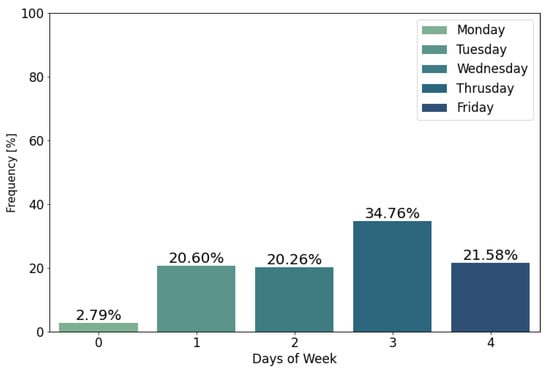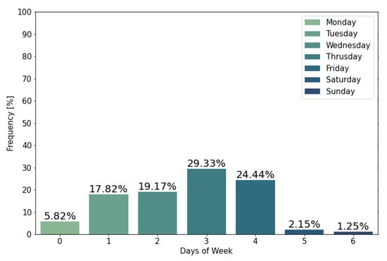 Figure 4 represents the weekly occurrences of email campaigns sent to the subscribers. The value zero represents the first day of the week (Monday), and the value four represents Friday. Thursdays (day = 3) have the highest email delivery rate, followed by Fridays (day = 4). Monday (day = 0) has the lowest number of email deliveries. These observations lead to the conclusion that email campaigns are more likely to be sent on Thursdays and Fridays. There are no campaigns sent on Saturdays and Sundays; therefore, this was not represented in Figure 4.