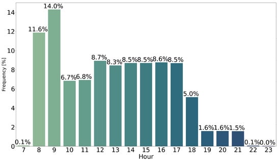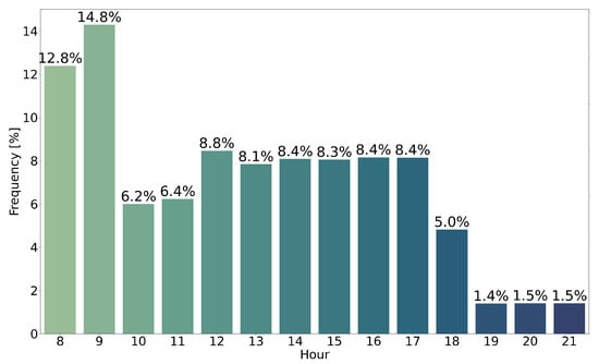 Figure 6 represents the hourly occurrences of email campaigns sent. Email delivery is higher during mornings (around 8 h and 9 h). Email delivery is also noticeable during lunchtime and in the afternoons (14 h to 17 h). These observations indicate that emails are more likely to be sent in the mornings. There were no campaigns sent between 22 h and 8 h; hence, this was not shown in Figure 6.