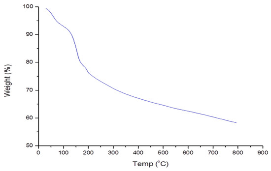 The thermogravimetric assay was used to investigate the pyrolysis chracteristics of the biopolymer. The first loss of weight (8%) was noted at 50 to 130 °C (Figure 3). The reduction in weight was attributed to the loss of the water content. The water content was derived from the functional components such as the carboxyl and hydroxyl [46]. Further weight loss was observed at 200 to 800 °C. The loss was credited to the dissociation of bioflocculant structure due to high temperatures. At 800 °C, about 58% of the bioflocculant residue was obtained. The obtained results affirmed the thermal stability of the biopolymer.