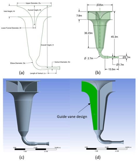 Instead of increasing the diameter of the lower funnel like previous research, the lower funnel diameter is fixed at 2 m and extended to the bottom of the funnel at the circular diameter of 7.8 m, giving a narrowing effect on the escaping air path, while the extended length of the guide vane also helps to guide the air towards the venturi throat section and, thus, prevent the early escape of the inlet air flow at the opposite end, directing sufficient speed of the air flow to enter the venturi throat and creating a low-pressure region at the venturi. Meanwhile, the extended length of lower-funnel diameter and guide vane could also prevent the formation of recirculation zone in the passage, which is undesirable and would reduce the amount of air to the venturi throat.